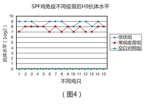 (一)在實驗室條件下,SPF雞7日齡一次免疫倍優(yōu)?系列產(chǎn)品(ND + H9 ) 0.1ml ,免疫后21天,倍優(yōu)組ND和H9抗 體分別達到8.1log2 (圖3 )和8.6log2 (圖4 );常規(guī)疫苗組ND和H9抗體分別僅為7.3log2 (圖3 )和7.6log2 (圖4)。