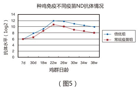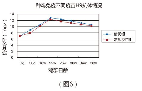 (二)在現(xiàn)場條件下,種雞分別與7日、30日和18周分別免疫倍優(yōu)TM系列產(chǎn)品(ND+H9),劑量分別為0.1ml、 0.3m和0.3ml。于22周,倍優(yōu)組ND和H9抗體分別達到12log2 (圖5 )和12.2log2 (圖6 ),且維持時間明顯優(yōu)于常規(guī)疫苗組;常規(guī)疫苗組ND和H9抗體分別僅為10.7log2 (圖5 )和11.8log2(圖6 )。
