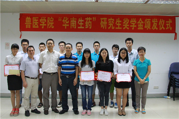 2015年6月24日下午3:30,“華南生藥”研究生獎學(xué)金頒獎暨揭牌儀式在農(nóng)業(yè)部畜禽產(chǎn)品質(zhì)量監(jiān)督檢驗(yàn)測試中心101報告廳舉行。廣州市華南農(nóng)大生物藥品有限公司梁昭平總經(jīng)理、營銷中心黃國城副總經(jīng)理、公司技術(shù)部李敏經(jīng)理、行政拓展部許芬芬經(jīng)理、我校獸醫(yī)學(xué)院黨委書記梁梓森、黨委副書記楊利江、輔導(dǎo)員陳曉梅老師、全體獲獎學(xué)生和學(xué)生代表出席并參加了掛牌儀式和頒獎典禮。