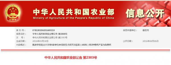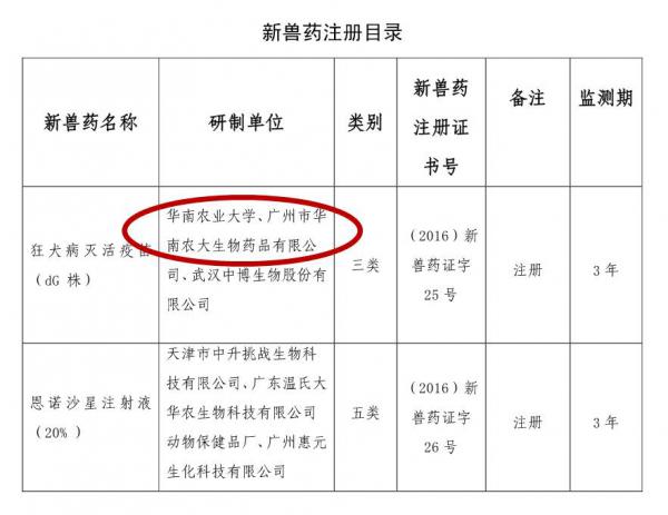 根據《獸藥管理條例》和《獸藥注冊辦法》規定,經審查,批準華南農業大學等6家單位申報的狂犬病滅活疫苗(dG株)等2種獸藥產品為新獸藥,核發《新獸藥注冊證書》,并發布產品試行規程、質量標準、說明書和標簽,自發布之日起執行。