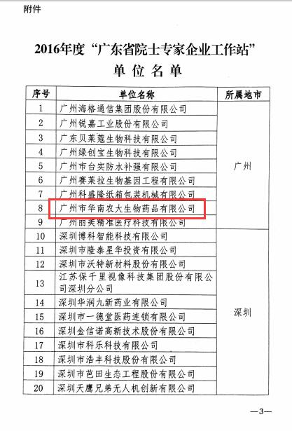 為貫徹落實《中共廣東省委 廣東省人民政府關于加強新時期科協(xié)工作的意見》(粵發(fā)[2013]2號)精神,充分發(fā)揮科協(xié)系統(tǒng)的組織網(wǎng)絡、人才智力和科學技術優(yōu)勢,進一步加快實施創(chuàng)新驅動發(fā)展戰(zhàn)略,將院士、專家等高端人才引入企業(yè),幫助企業(yè)解決技術難題,培養(yǎng)科技創(chuàng)新人才,促進產(chǎn)學研合作,提高企業(yè)核心競爭力,依據(jù)《廣東省“院士專家企業(yè)工作站”管理辦法(試行)》的規(guī)定,經(jīng)有關單位申請、地方科協(xié)推薦、實地考察調研,省科協(xié)決定在廣州市華南農(nóng)大生物藥品有限公司等44家單位建立“廣東省院士專家企業(yè)工作站”。建站期為2016年12月至2019年12月。