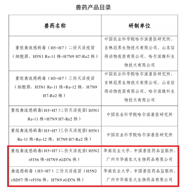 熱烈祝賀華南農業大學中國獸醫藥品監察所廣州市華南農大生物藥品有限公司聯合研制的重組禽流感病毒(H5+H7)二價滅活疫苗(H5N2 rFJ56株+H7N9 rGD76株)重組禽流感病毒(H5+H7)三價滅活疫苗(H5N2 rSD57株+rFJ56株,H7N9 rGD76株)兩個產品通過農業農村部新獸藥評價!!!