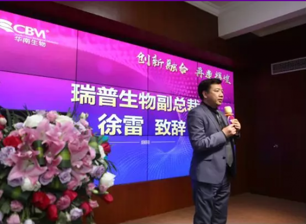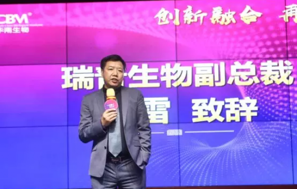 瑞普生物副總裁徐雷致辭,首先代表瑞普生物對公司2019年取得的驕人成績致以衷心的祝賀!2019年是華南生物開拓創新的一年,市場的高速發展為企業帶來了新的機遇;2020年,希望華南生物在產品升級和技術服務上發揮創新優勢,在未來多變的市場競爭中,精準定位,立足打造禽流感高端產品戰略。